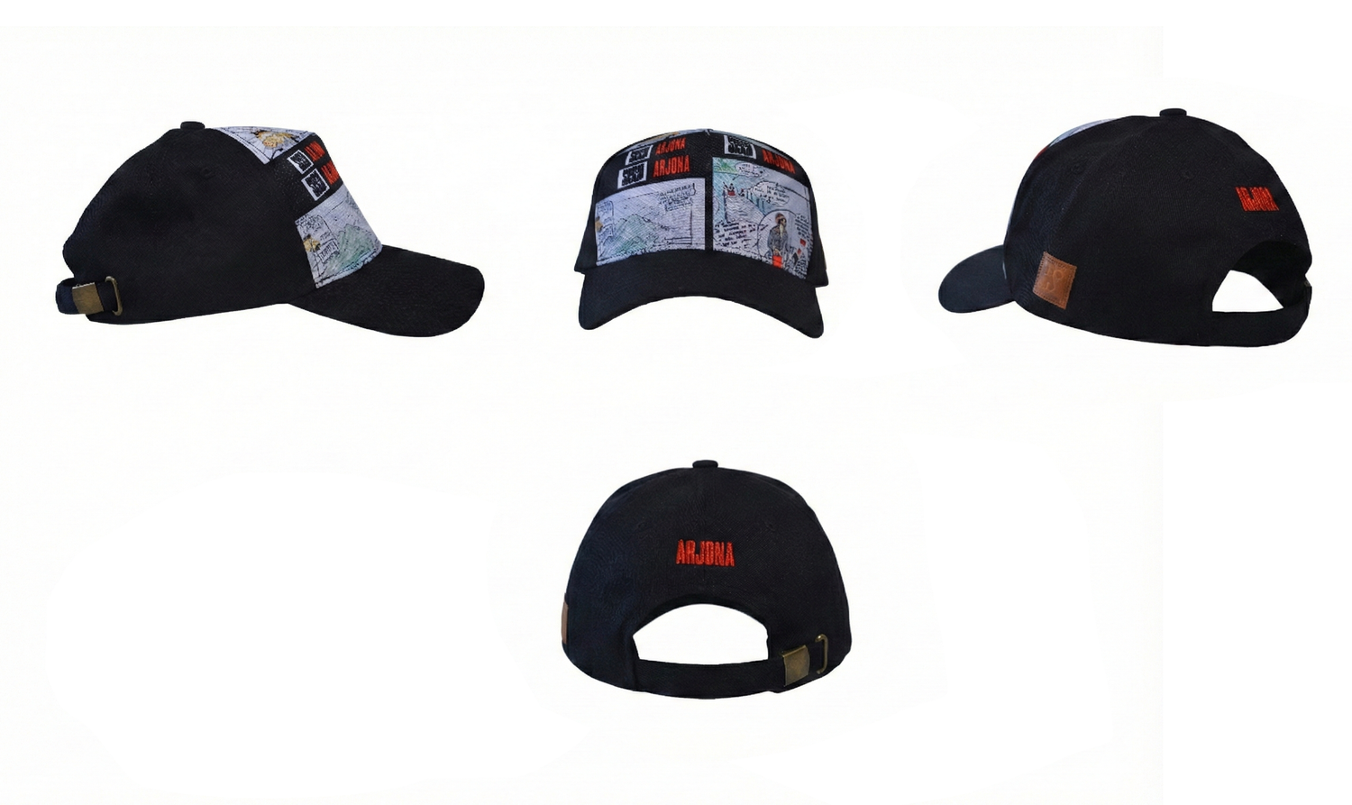 Gorra sublimada con ilustración tipo historieta del Lago Atitlán, GUATEMALA. Parche de cuero trabajado por artesanos de Antigua, GUATEMALA.